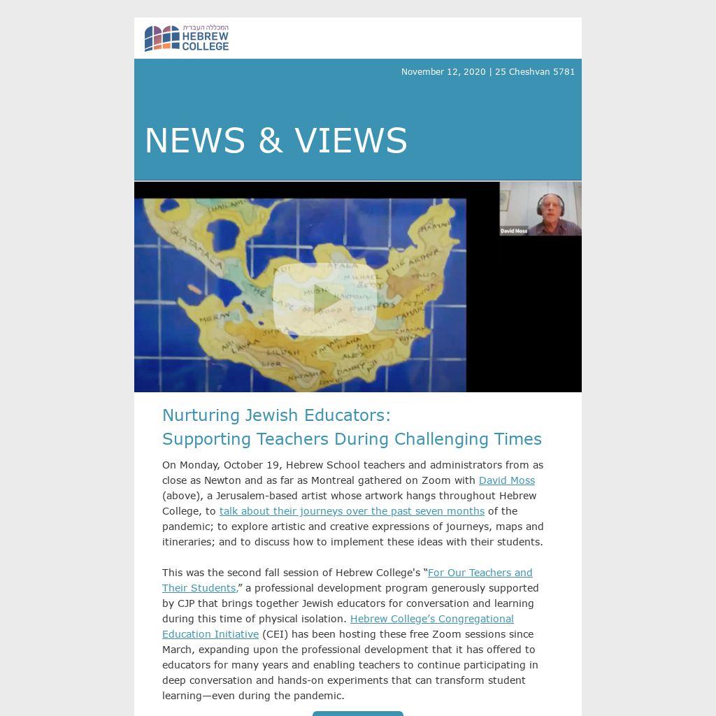 This was the second fall session of Hebrew College's “For Our Teachers and Their Students,” a professional development program generously supported by CJP that brings together Jewish educators for conversation and learning during this time of physical isolation. Hebrew College’s Congregational Education Initiative (CEI) has been hosting these free Zoom sessions since March, expanding upon the professional development that it has offered to educators for many years and enabling teachers to continue participating in deep conversation and hands-on experiments that can transform student learning—even during the pandemic.