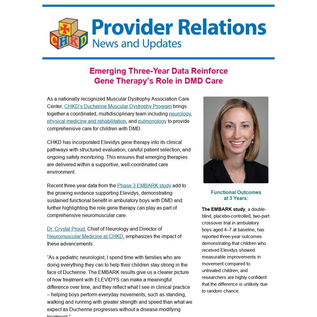 CHKD has incorporated Elevidys gene therapy into its clinical pathways with structured evaluation, careful patient selection, and ongoing safety monitoring. This ensures that emerging therapies are delivered within a supportive, well-coordinated care environment.