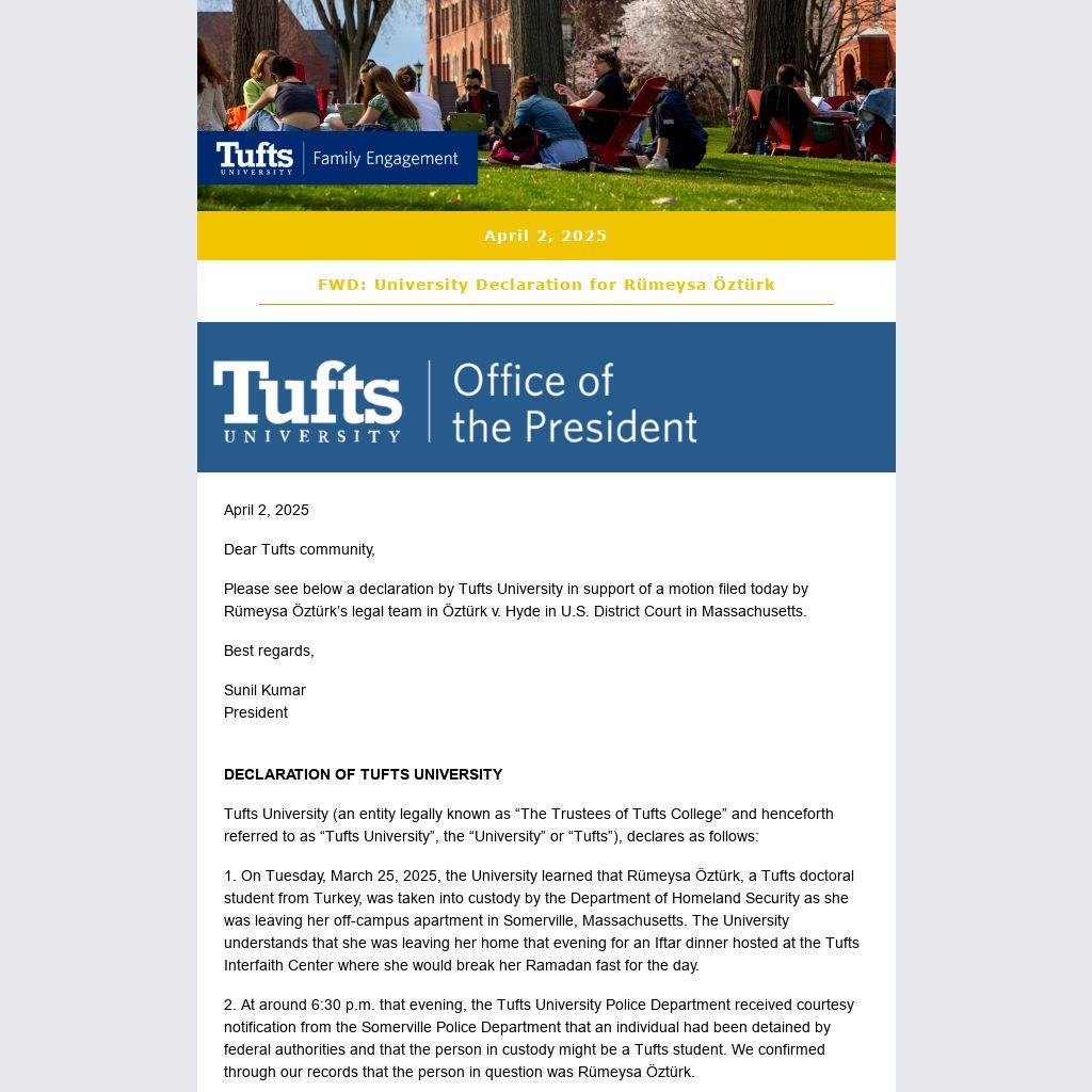 Please see below a declaration by Tufts University in support of a motion filed today by Rümeysa Öztürk’s legal team in Öztürk v. Hyde in U.S. District Court in Massachusetts.