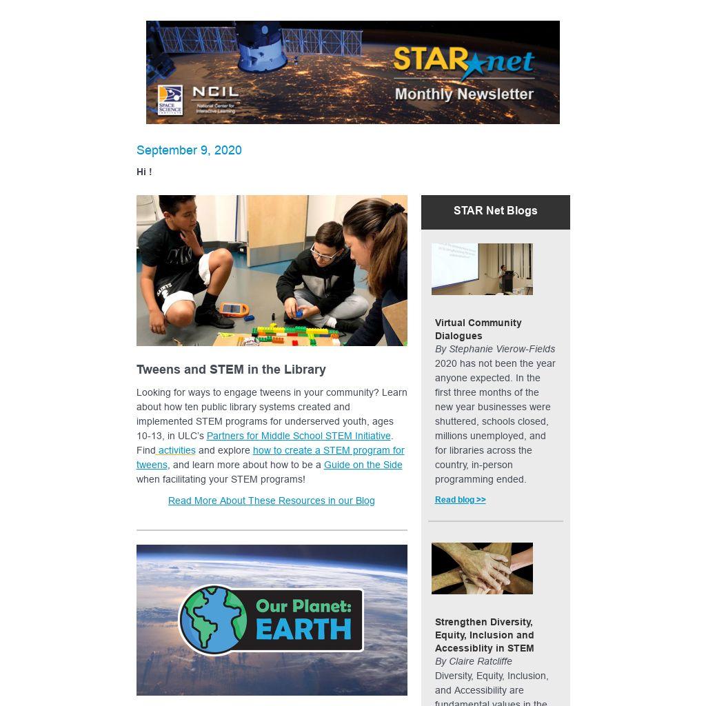 STAR Net is built upon a strong network of collaborators and partners, led by the Space Science Institute’s (SSI) National Center for Interactive Learning (NCIL). Partners include the American Library Association’s Public Programs Office, Collaborative Summer Library Program, Chief Officers of State Library Agencies, Lunar and Planetary Institute, Education Development Center, Twin Cities PBS (TPT), Institute for Learning Innovation (ILI), University of Colorado, University of Virginia, Urban Libraries Council, American Society of Civil Engineers, and Cornerstones of Science. Funding is provided by the National Science Foundation, NASA Science Mission Directorate, and the Institute of Museum and Library Services.
