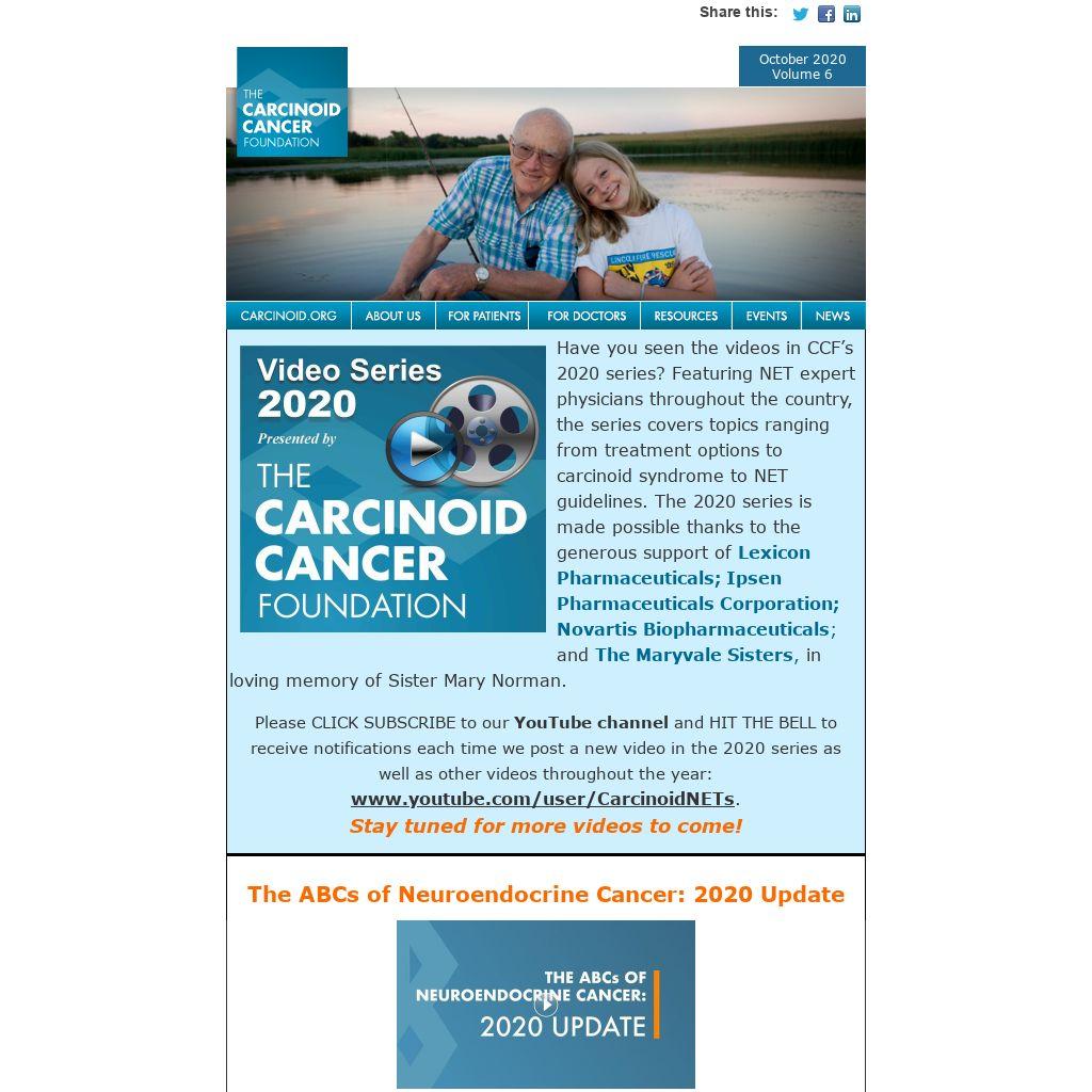 Have you seen the videos in CCF’s 2020 series? Featuring NET expert physicians throughout the country, the series covers topics ranging from treatment options to carcinoid syndrome to NET guidelines. The 2020 series is made possible thanks to the generous support of Lexicon Pharmaceuticals; Ipsen Pharmaceuticals Corporation; Novartis Biopharmaceuticals; and The Maryvale Sisters, in loving memory of Sister Mary Norman.