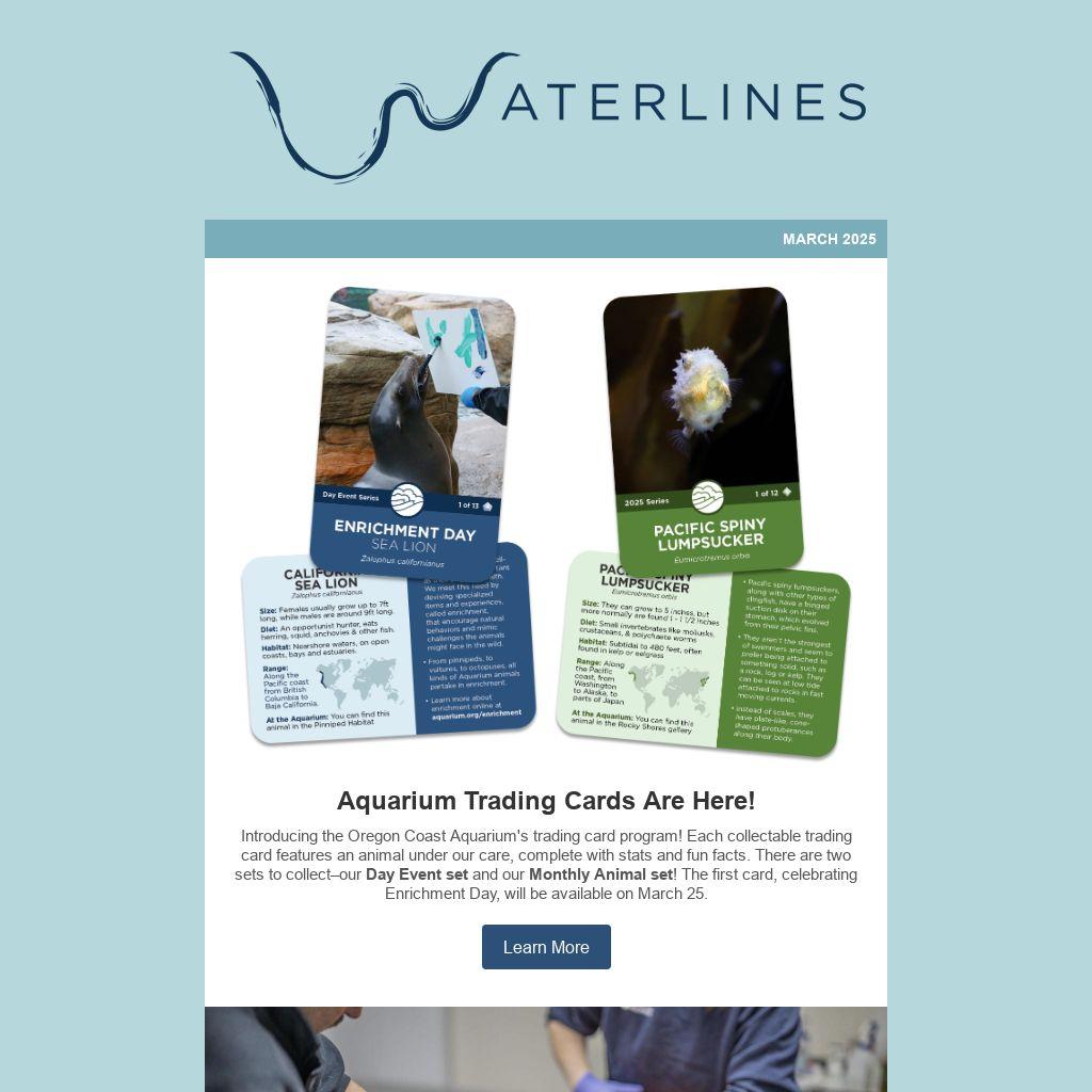 Waterlines is a monthly newsletter from the Oregon Coast Aquarium that communicates upcoming events, staff and animal updates, monthly membership benefits, Oregon coast-related content and more. |