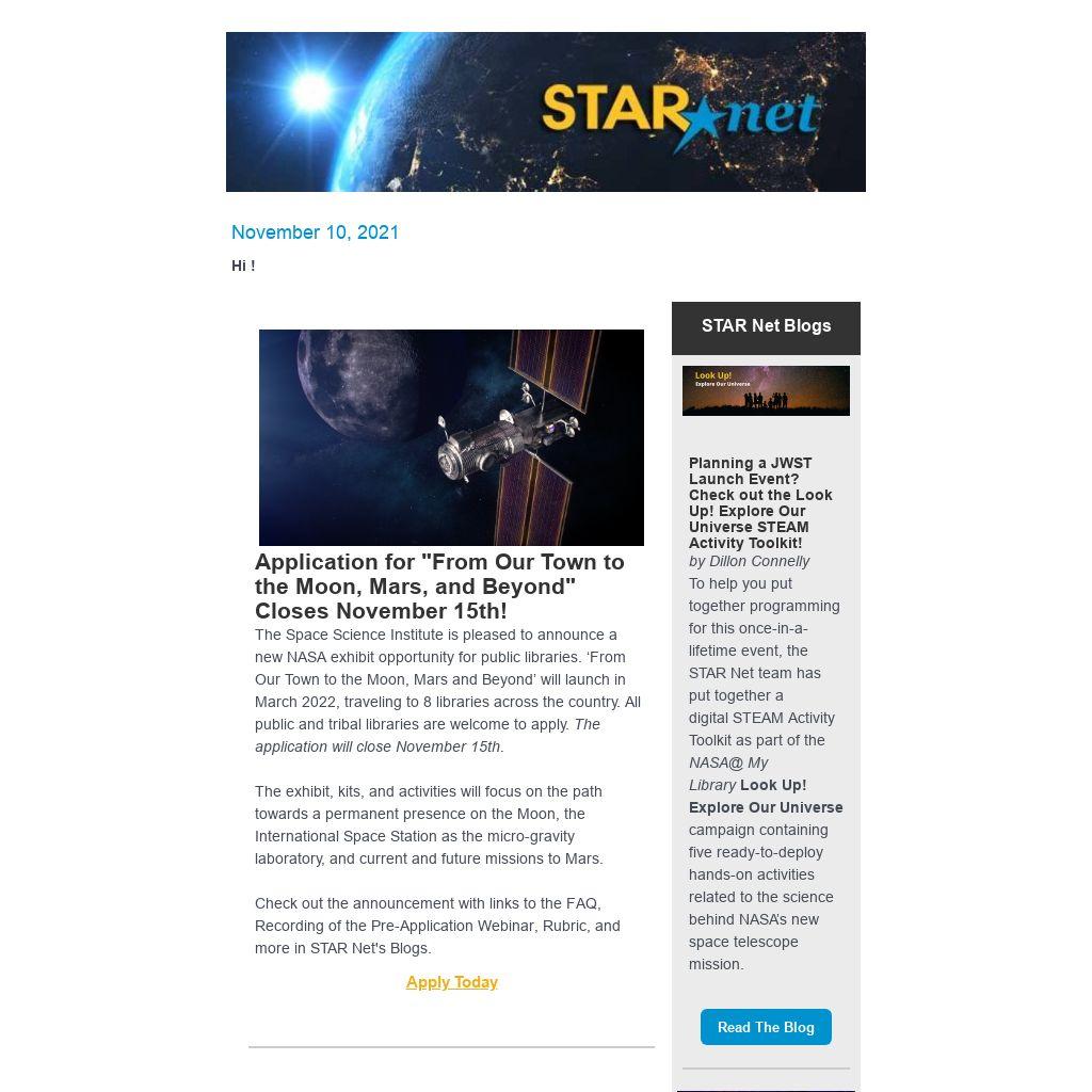 STAR Net is built upon a strong network of collaborators and partners, led by the Space Science Institute’s (SSI) National Center for Interactive Learning (NCIL). Partners include the American Library Association’s Public Programs Office, Collaborative Summer Library Program, Chief Officers of State Library Agencies, Lunar and Planetary Institute, Education Development Center, Twin Cities PBS (TPT), Institute for Learning Innovation (ILI), University of Colorado. Funding is provided by the National Science Foundation, and the NASA Science Mission Directorate.