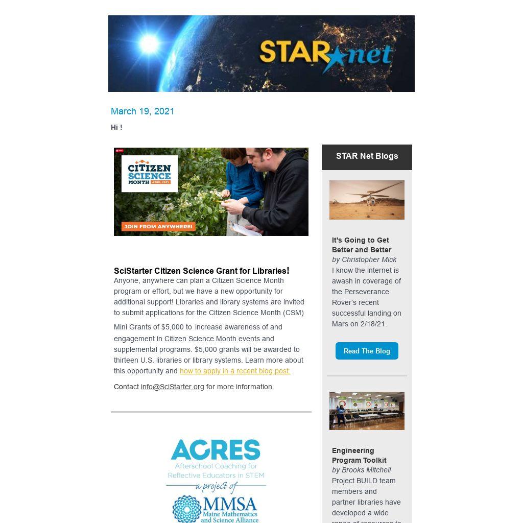 STAR Net is built upon a strong network of collaborators and partners, led by the Space Science Institute’s (SSI) National Center for Interactive Learning (NCIL). Partners include the American Library Association’s Public Programs Office, Collaborative Summer Library Program, Chief Officers of State Library Agencies, Lunar and Planetary Institute, Education Development Center, Twin Cities PBS (TPT), Institute for Learning Innovation (ILI), University of Colorado, University of Virginia, Urban Libraries Council, American Society of Civil Engineers, and Cornerstones of Science. Funding is provided by the National Science Foundation, NASA Science Mission Directorate, and the Institute of Museum and Library Services.