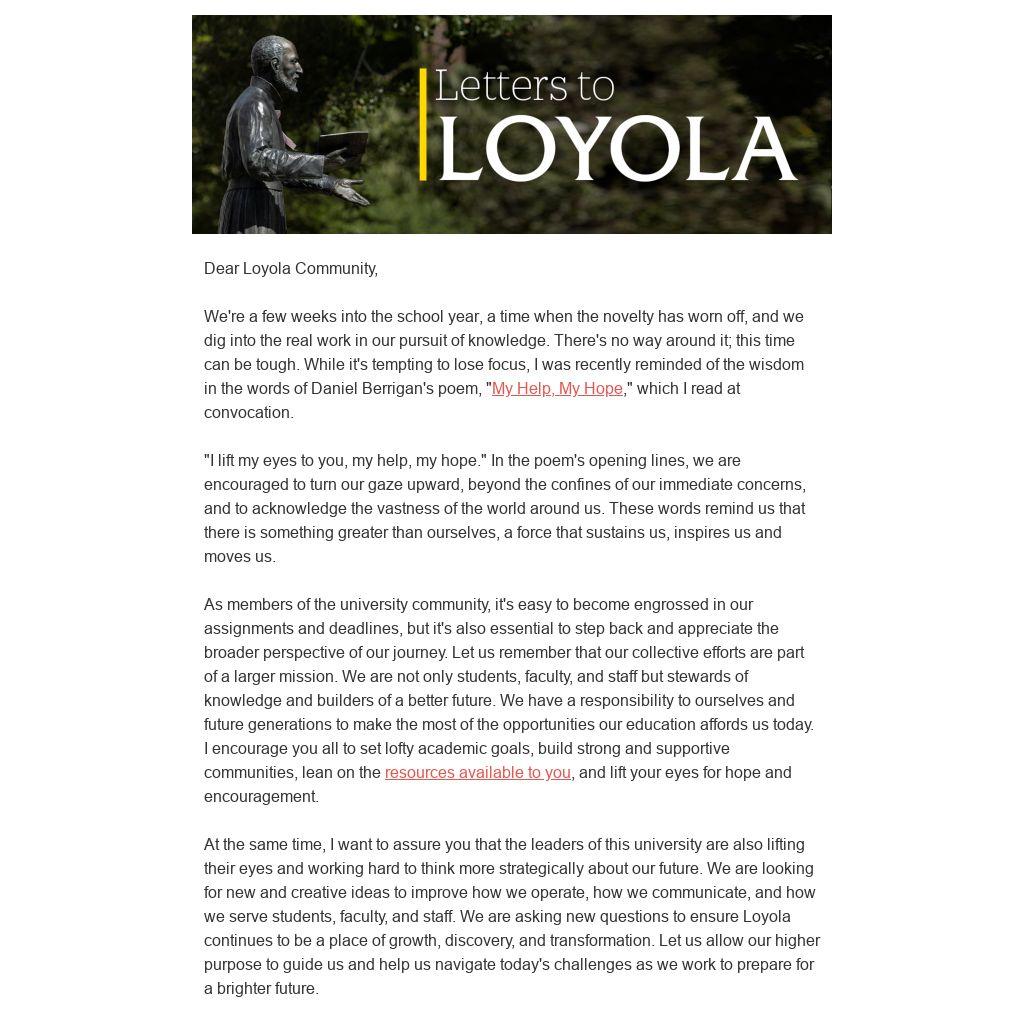 At the same time, I want to assure you that the leaders of this university are also lifting their eyes and working hard to think more strategically about our future. We are looking for new and creative ideas to improve how we operate, how we communicate, and how we serve students, faculty, and staff. We are asking new questions to ensure Loyola continues to be a place of growth, discovery, and transformation. Let us allow our higher purpose to guide us and help us navigate today's challenges as we work to prepare for a brighter future.