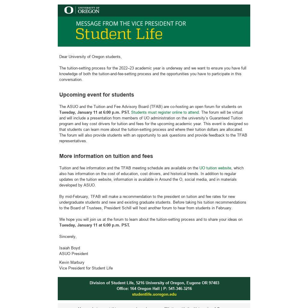 The ASUO and the Tuition and Fee Advisory Board (TFAB) are co-hosting an open forum for students on Tuesday, January 11 at 6:00 p.m. PST. Students must register online to attend. The forum will be virtual and will include a presentation from members of UO administration on the university’s Guaranteed Tuition program and key cost drivers for tuition and fees for the upcoming academic year. This event is designed so that students can learn more about the tuition-setting process and where their tuition dollars are allocated. The forum will also provide students with an opportunity to ask questions and provide feedback to the TFAB representatives.