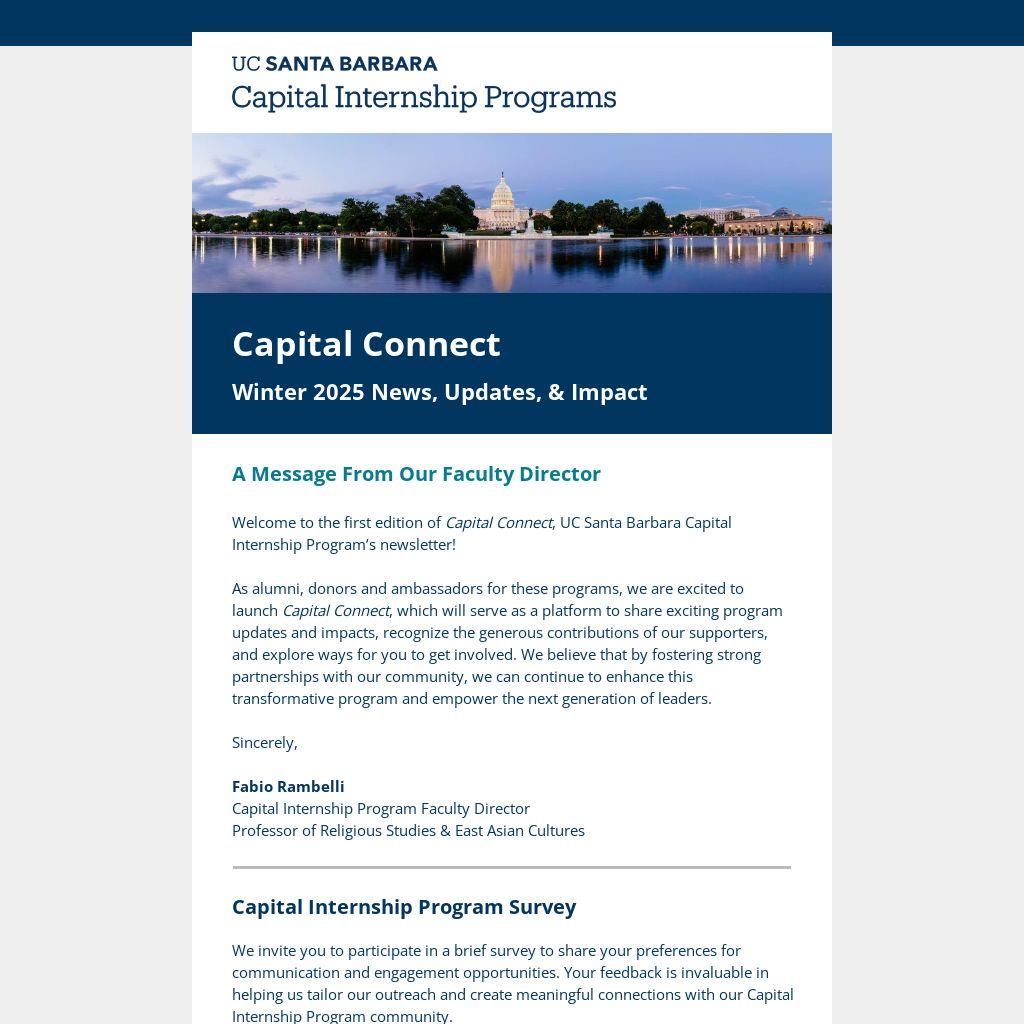 We invite you to participate in a brief survey to share your preferences for communication and engagement opportunities. Your feedback is invaluable in helping us tailor our outreach and create meaningful connections with our Capital Internship Program community.