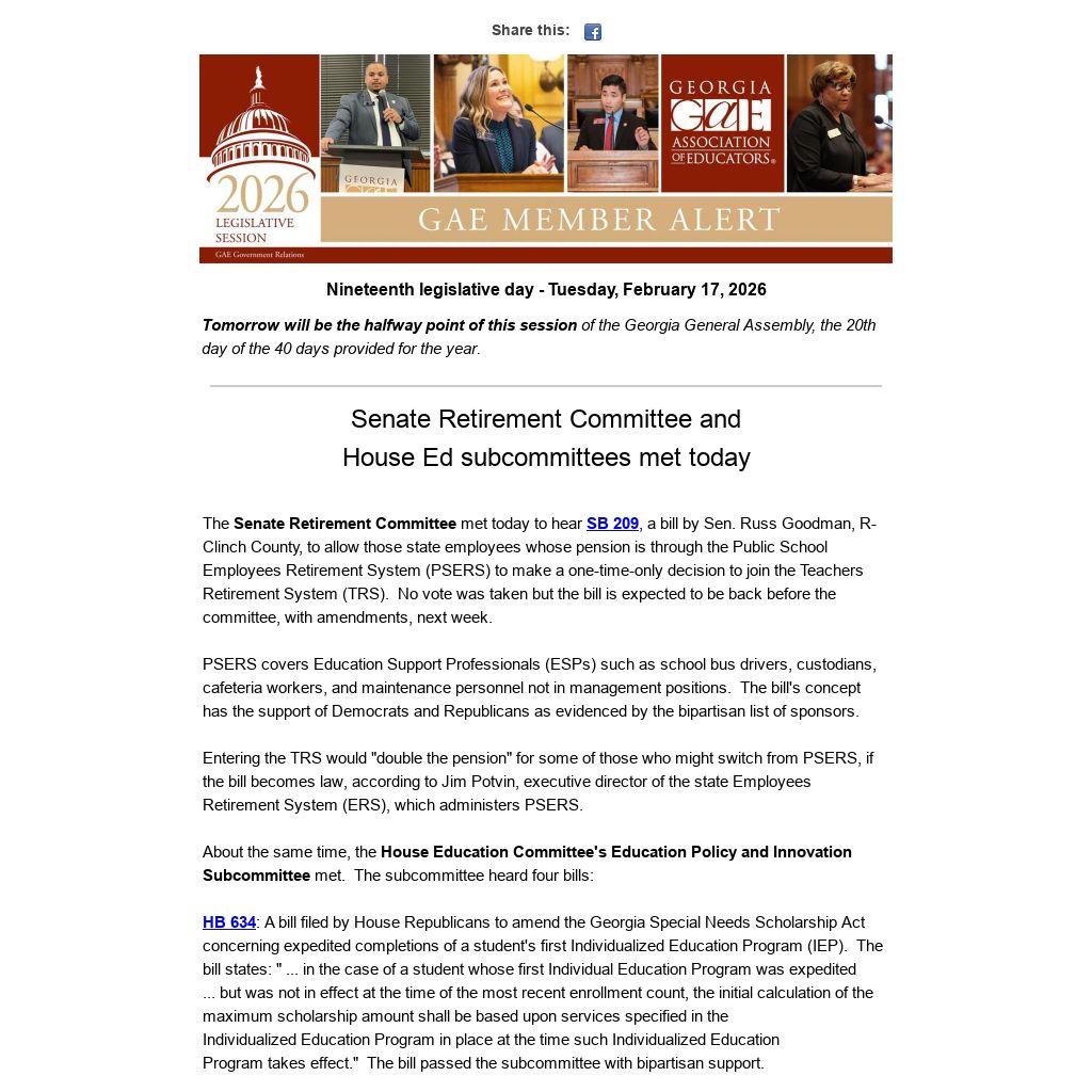 The Senate Retirement Committee met today to hear SB 209, a bill by Sen. Russ Goodman, R-Clinch County, to allow those state employees whose pension is through the Public School Employees Retirement System (PSERS) to make a one-time-only decision to join the Teachers Retirement System (TRS). No vote was taken but the bill is expected to be back before the committee, with amendments, next week.
