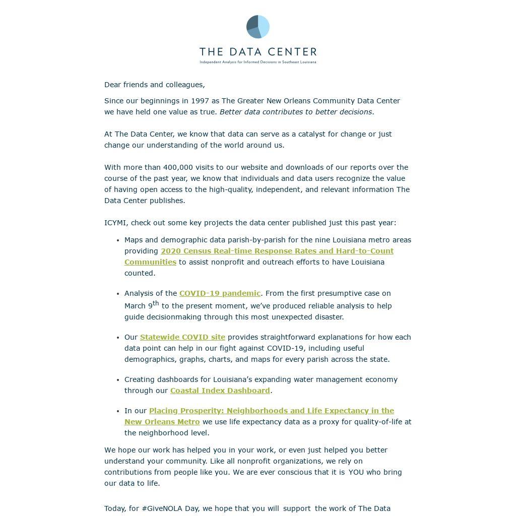Today, for #GiveNOLA Day, we hope that you will support the work of The Data Center. You can make a difference! Donate today and together we will make informed decisions possible!