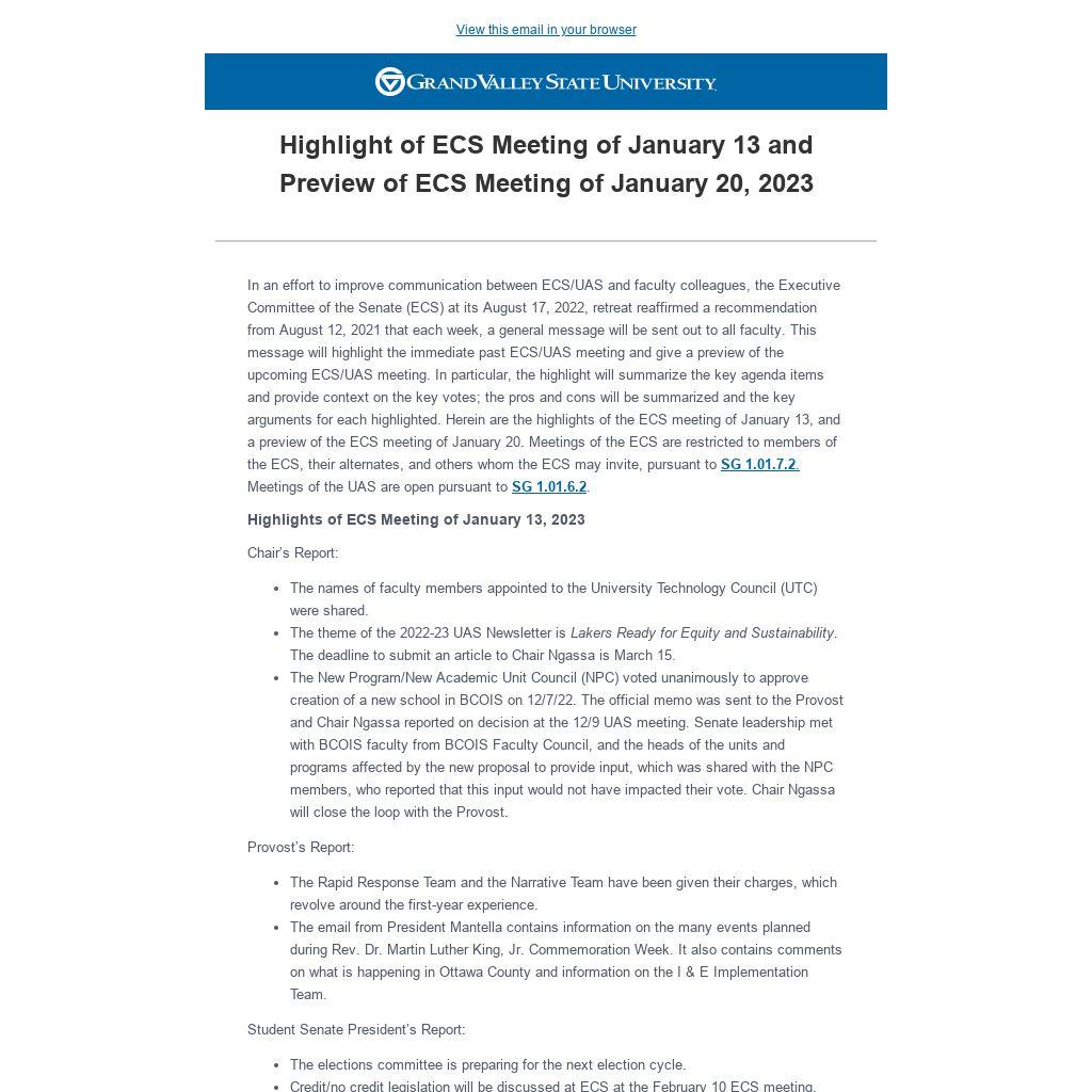In an effort to improve communication between ECS/UAS and faculty colleagues, the Executive Committee of the Senate (ECS) at its August 17, 2022, retreat reaffirmed a recommendation from August 12, 2021 that each week, a general message will be sent out to all faculty. This message will highlight the immediate past ECS/UAS meeting and give a preview of the upcoming ECS/UAS meeting. In particular, the highlight will summarize the key agenda items and provide context on the key votes; the pros and cons will be summarized and the key arguments for each highlighted. Herein are the highlights of the ECS meeting of January 13, and a preview of the ECS meeting of January 20. Meetings of the ECS are restricted to members of the ECS, their alternates, and others whom the ECS may invite, pursuant to SG 1.01.7.2. Meetings of the UAS are open pursuant to SG 1.01.6.2.