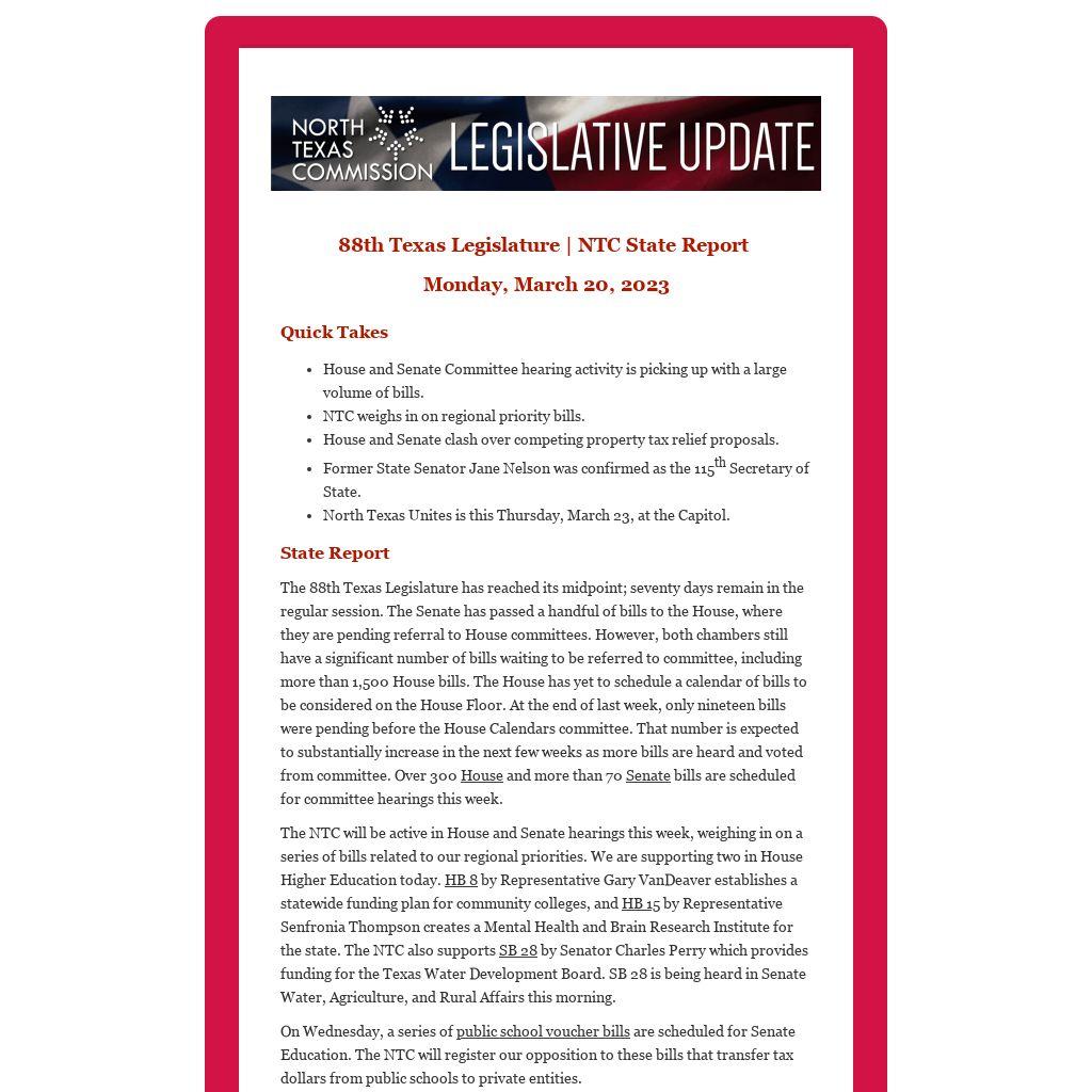 Join us on March 23, 2023, as we travel to Austin for North Texas Unites. This full-day event will feature a variety of meetings with members of the North Texas delegation and end with an evening reception at the Capitol. The NTC team has noted several large-scale events are taking place in Austin during the week of North Texas Unites, so we encourage you to purchase your ticket and book your hotel as soon as possible!