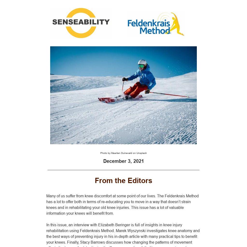Our knee joint is what's technically called a "modified hinge" that permits a large amount of bending and straightening but only a tiny amount of rotations when the knee is bent. Ideally, our joint surfaces remain parallel to each other. The knee joint is vulnerable to overuse and injury, especially when forced to move outside its intended range of motion. Particularly dangerous are side-to-side movements and twisting. Dr. Feldenkrais called such a side-to-side misalignment "gapping of a joint" where joint surfaces are compressed excessively on one side and separated on the other. Lateral gapping of the knee contributes to overstretching ligaments, muscular imbalances, tearing of menisci, damage of the cartilage, and excessive loading of one side of the joint - likely precursors of osteoarthritis.(...)
