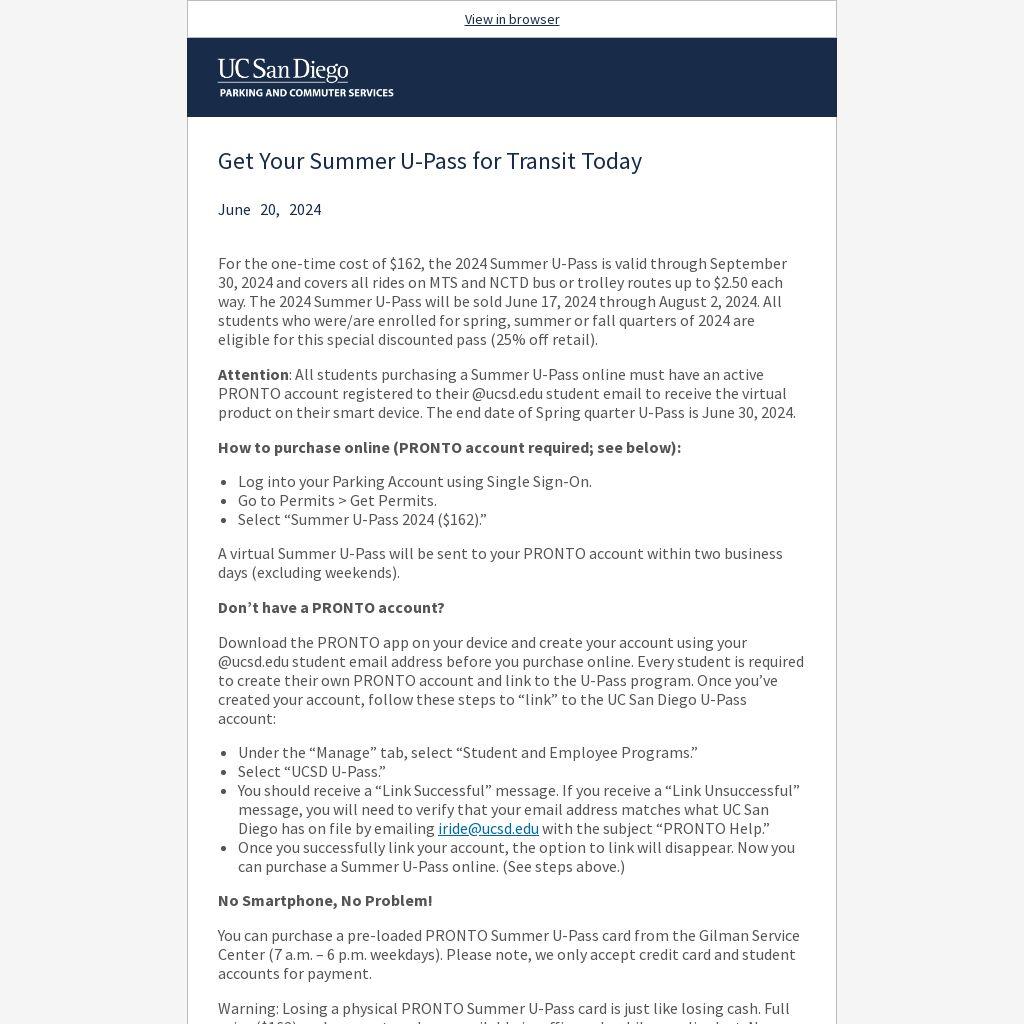Attention: All students purchasing a Summer U-Pass online must have an active PRONTO account registered to their @ucsd.edu student email to receive the virtual product on their smart device. The end date of Spring quarter U-Pass is June 30, 2024.