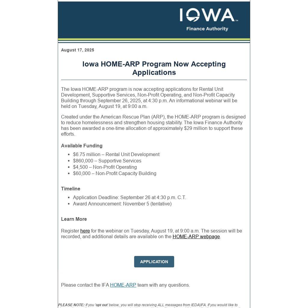 The Iowa HOME-ARP program is now accepting applications for Rental Unit Development, Supportive Services, Non-Profit Operating, and Non-Profit Capacity Building through September 26, 2025, at 4:30 p.m. An informational webinar will be held on Tuesday, August 19, at 9:00 a.m.