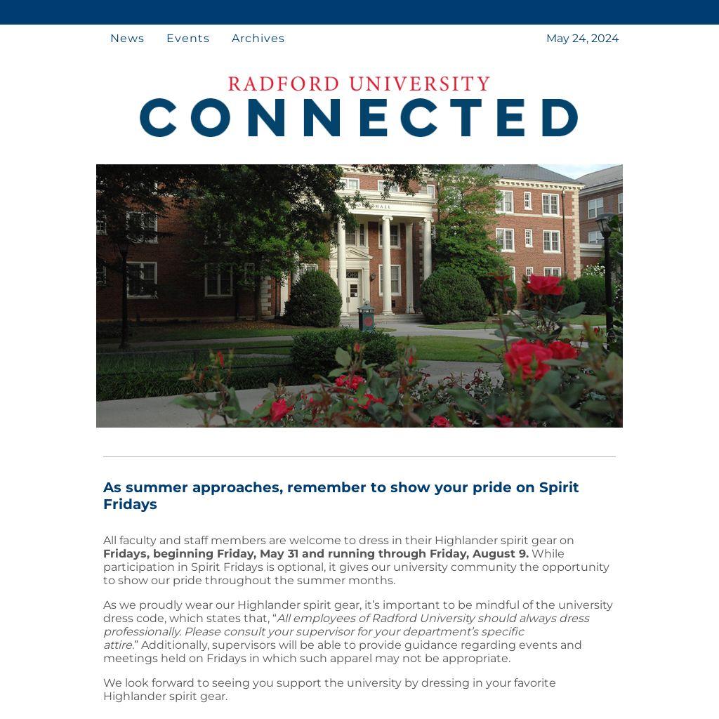 As we proudly wear our Highlander spirit gear, it’s important to be mindful of the university dress code, which states that, “All employees of Radford University should always dress professionally. Please consult your supervisor for your department’s specific attire.” Additionally, supervisors will be able to provide guidance regarding events and meetings held on Fridays in which such apparel may not be appropriate.