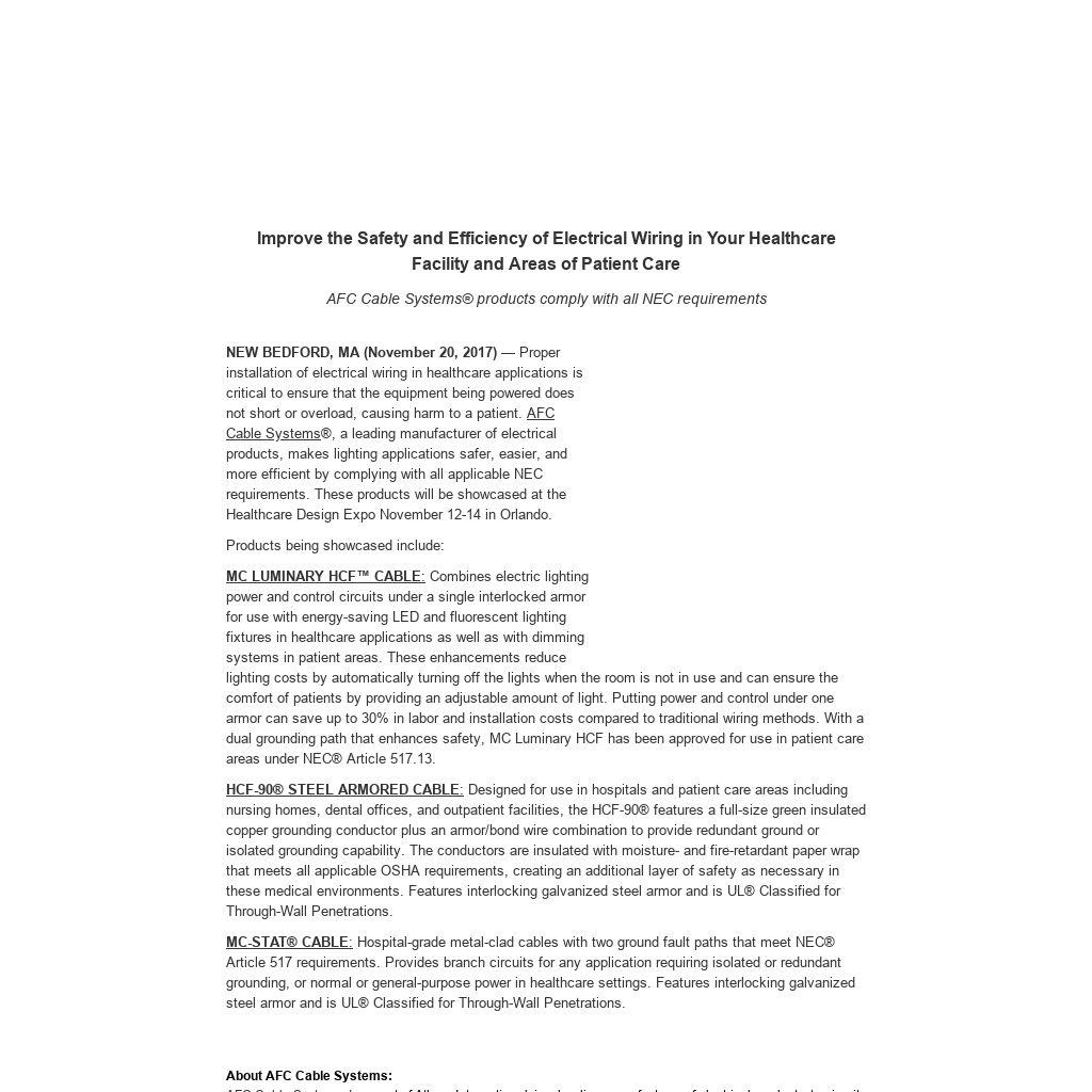 AFC Cable Systems®, a leading manufacturer of electrical products, makes lighting applications safer, easier, and more efficient by complying with all applicable NEC requirements. These products will be showcased at the Healthcare Design Expo November 12-14 in Orlando.