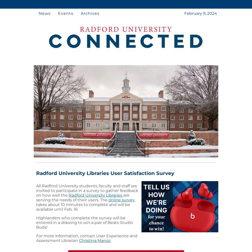 All Radford University students, faculty and staff are invited to participate in a survey to gather feedback on how well the Radford University Libraries are serving the needs of their users. The online survey takes about 10 minutes to complete and will be available until Feb. 16.