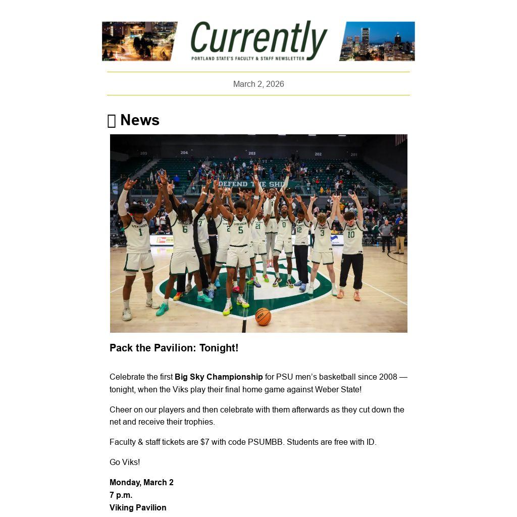CURRENTLY is a weekly newsletter for the employees of Portland State University, published by University Communications. News items, events and accolades should be sent to currently@pdx.edu. Deadline is noon, the Tuesday before publication. See the Currently website for submission guidelines and schedule.