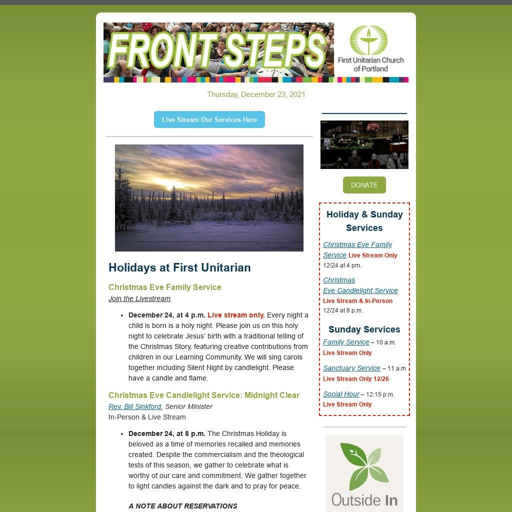 We share our plate this Christmas Eve with First Unitarian's long-time community partner, Outside In. Since 1968, Outside In has helped to break the cycles of chronic homelessness, poverty, and poor health among those experiencing houselessness, and the underserved.