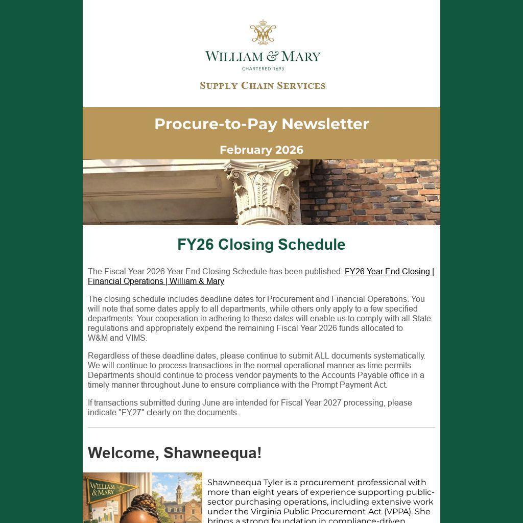 Shawneequa currently serves as a Senior Sourcing Specialist in Supply Chain Services, where she continues to build on her expertise in strategic sourcing and cross-functional collaboration. Prior to this role, she contributed to the Purchasing Department for the City of Newport News, supporting municipal procurement operations.
