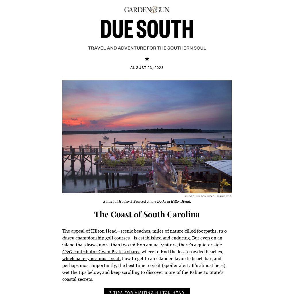 The appeal of Hilton Head—scenic beaches, miles of nature-filled footpaths, two dozen championship golf courses—is established and enduring. But even on an island that draws more than two million annual visitors, there’s a quieter side. G&G contributor Gwen Pratesi shares where to find the less-crowded beaches, which bakery is a must-visit, how to get to an islander-favorite beach bar, and perhaps most importantly, the best time to visit (spoiler alert: It’s almost here). Get the tips below, and keep scrolling to discover more of the Palmetto State’s coastal secrets.
