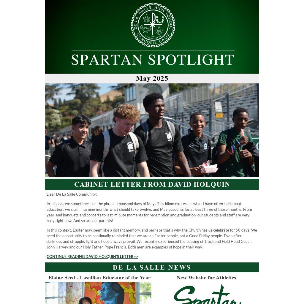 We are closing in on the end of the De La Salle spring sports season, as EBAL and NCS playoffs are getting underway. The golf team won the EBAL Championship on Monday, while league championships for baseball, lacrosse, volleyball, swimming & diving, track & field, and volleyball will be happening over the next few weeks. Please refer to DLSSpartans.org for your Athletic Department updates and upcoming playoff schedules.