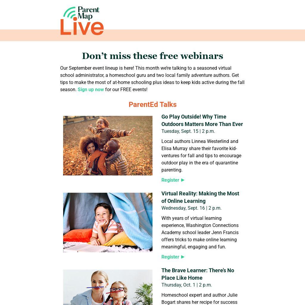 Our September event lineup is here! This month we’re talking to a seasoned virtual school administrator, a homeschool guru and two local family adventure authors. Get tips to make the most of at-home schooling plus ideas to keep kids active during the fall season. Sign up now for our FREE events!