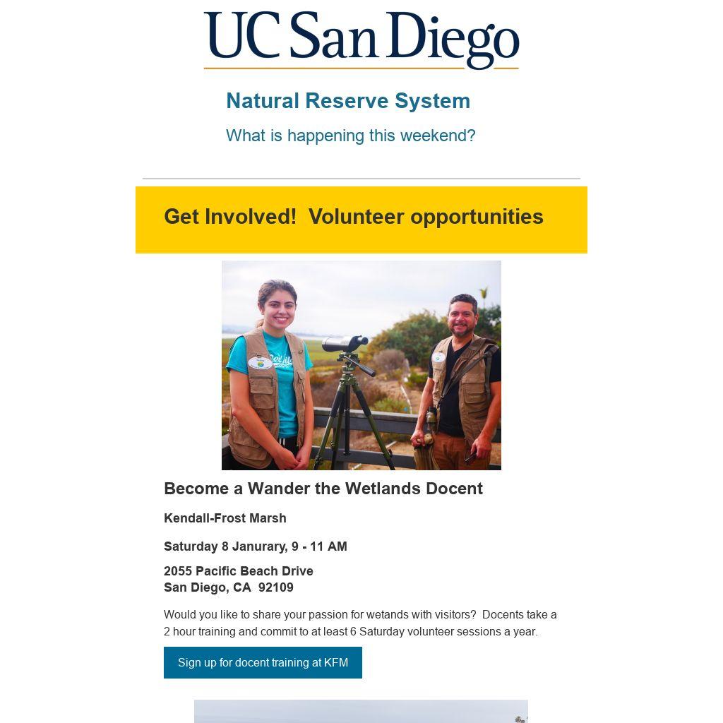 Join the UC Natural Reserve System and the San Diego Audubon Society for Love Your Wetlands Day at the Kendall Frost Marsh. This is a once-a-year opportunity to explore the Kendall-Frost Marsh Reserve in Mission Bay, while also learning about the importance of coastal wetlands, the threats that they are facing, and how local communities are working to restore and protect them. Activities are family friendly and include guided walking tours, live animal presentations, booths from environmental organizations, games for kids, and opportunities to get a little muddy helping with restoration tasks around the marsh.