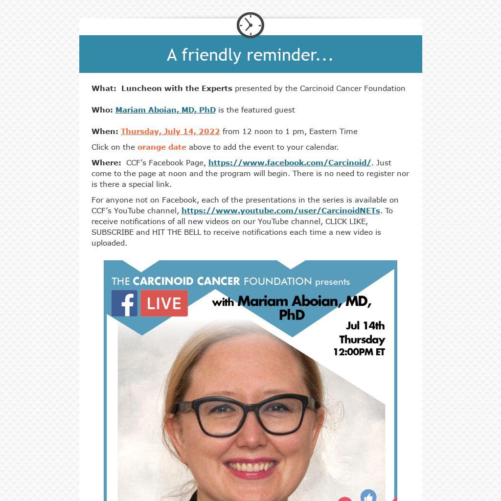 What:  Luncheon with the Experts presented by the Carcinoid Cancer Foundation