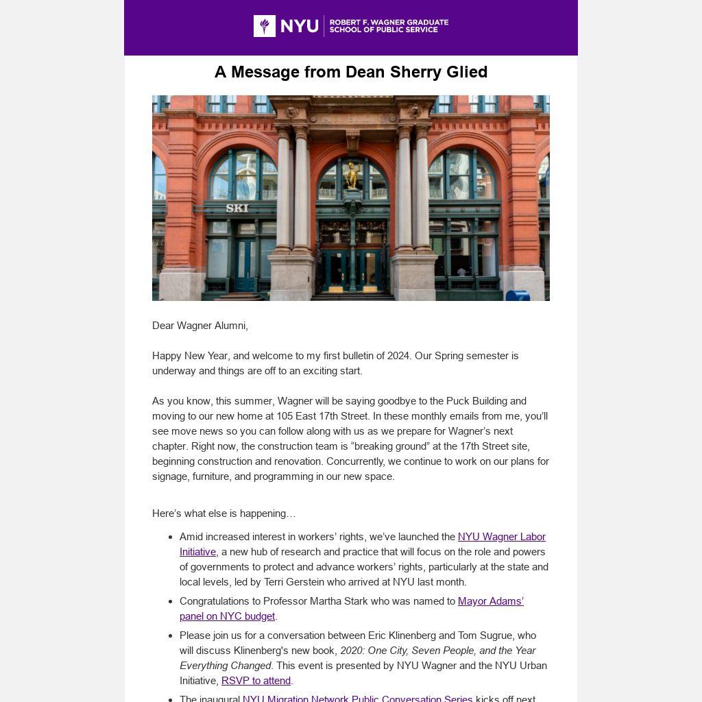 - Amid increased interest in workers’ rights, we’ve launched the NYU Wagner Labor Initiative, a new hub of research and practice that will focus on the role and powers of governments to protect and advance workers’ rights, particularly at the state and local levels, led by Terri Gerstein who arrived at NYU last month.