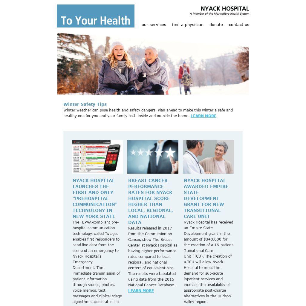 The information provided by this enewsletter is intended to educate readers about subjects pertinent to their health. Consult your healthcare provider concerning how the information contained here relates to your personal health. Nyack Hospital, a member of the Montefiore Health System, will not be held responsible for misuse of information stated in these resources.