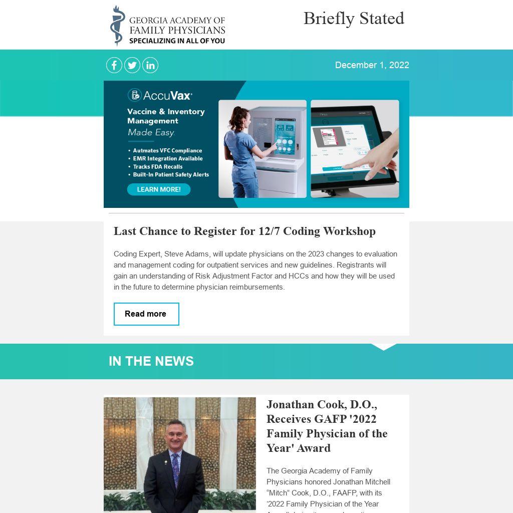 Copyright 2022 Georgia Academy of Family Physicians To ensure that e-mails from GAFP are delivered to your inbox, please add gafp@gafp.org to your address book or list of approved senders.