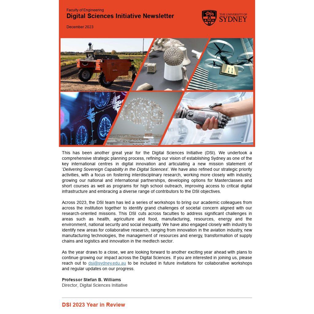 This has been another great year for the Digital Sciences Initiative (DSI). We undertook a comprehensive strategic planning process, refining our vision of establishing Sydney as one of the key international centres in digital innovation and articulating a new mission statement of ‘Delivering Sovereign Capability in the Digital Sciences’. We have also refined our strategic priority activities, with a focus on fostering interdisciplinary research, working more closely with industry, growing our national and international partnerships, developing options for Masterclasses and short courses as well as programs for high school outreach, improving access to critical digital infrastructure and embracing a diverse range of contributors to the DSI objectives.
