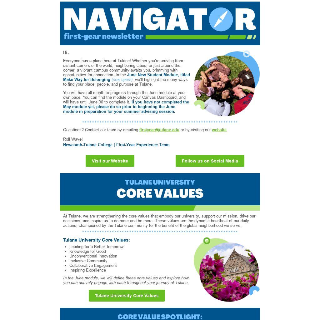 In the June module, we will define these core values and explore how you can actively engage with each throughout your journey at Tulane.