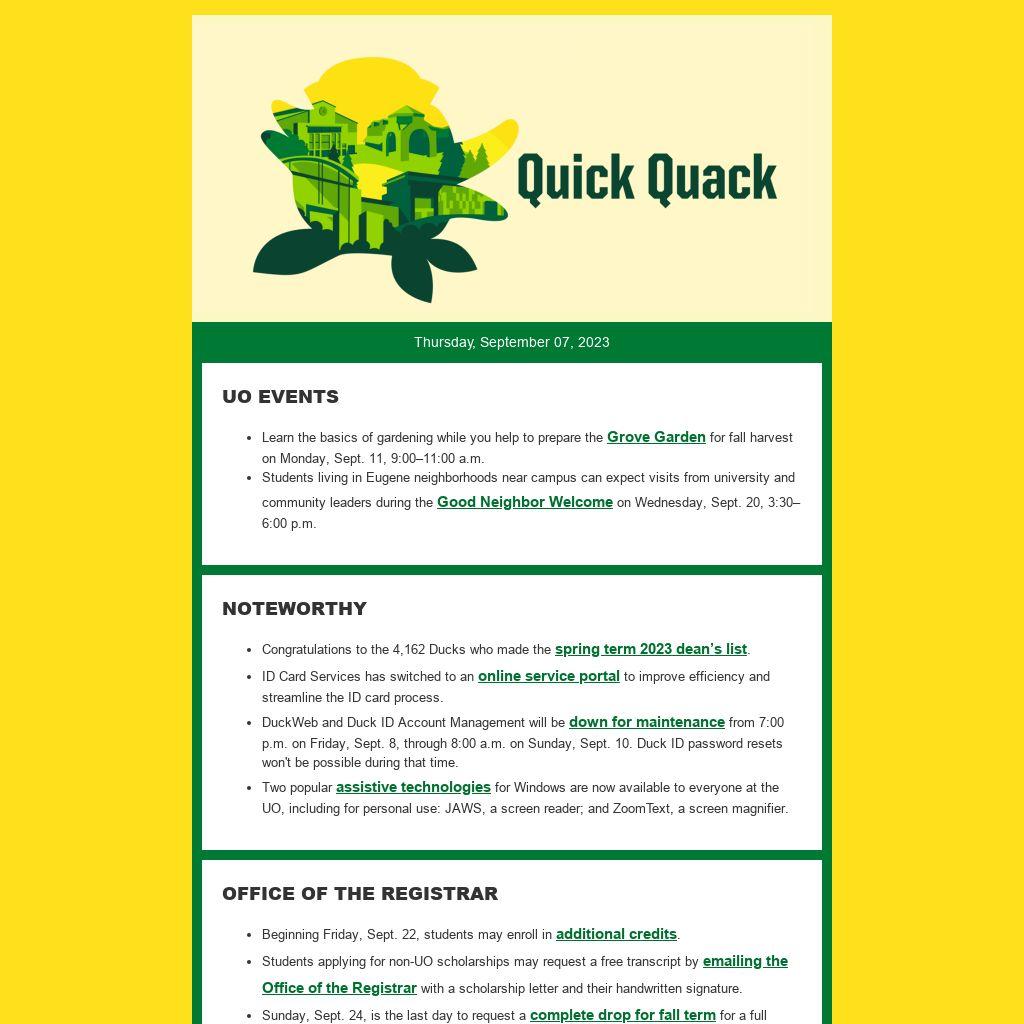 DuckWeb and Duck ID Account Management will be down for maintenance from 7:00 p.m. on Friday, Sept. 8, through 8:00 a.m. on Sunday, Sept. 10. Duck ID password resets won't be possible during that time.