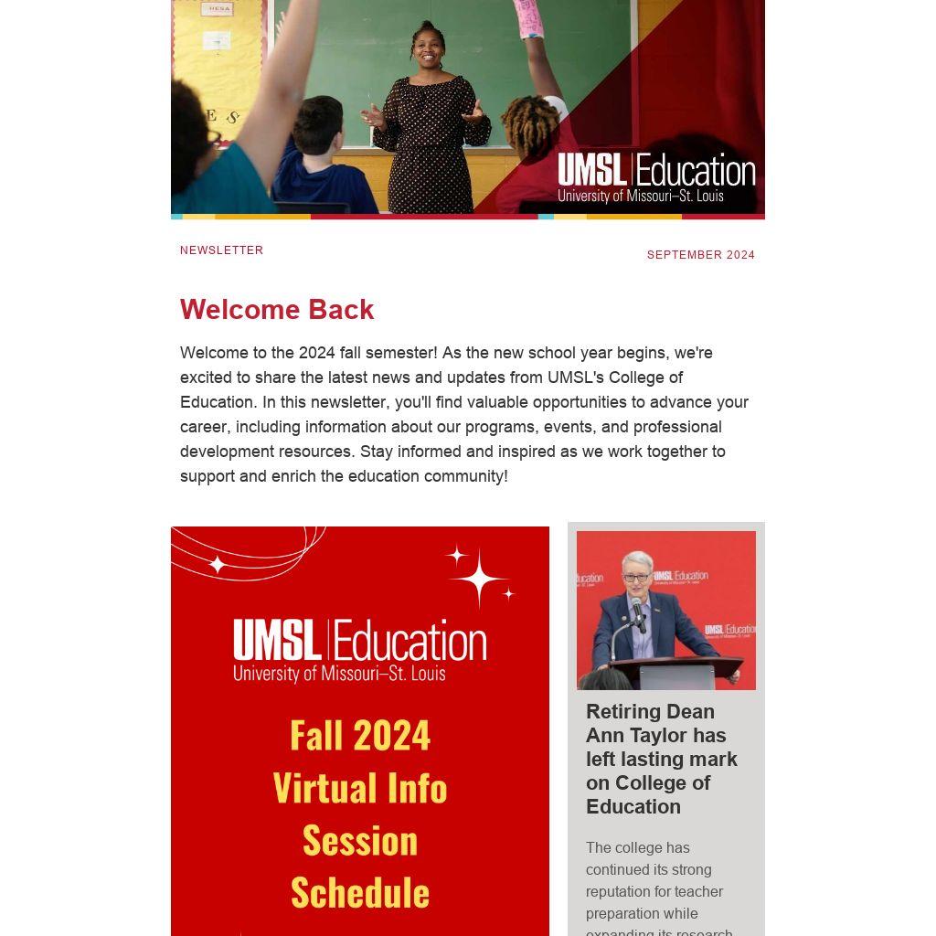 Welcome to the 2024 fall semester! As the new school year begins, we're excited to share the latest news and updates from UMSL's College of Education. In this newsletter, you'll find valuable opportunities to advance your career, including information about our programs, events, and professional development resources. Stay informed and inspired as we work together to support and enrich the education community! |