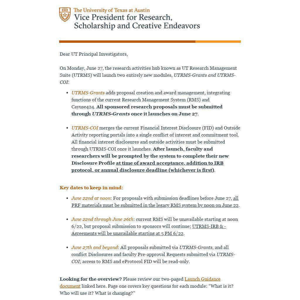 - June 27th and beyond: All proposals submitted via UTRMS-Grants, and all conflict Disclosures and faculty Pre-approval Requests submitted via UTRMS-COI; access to RMS and eProtocol FID will be read-only.