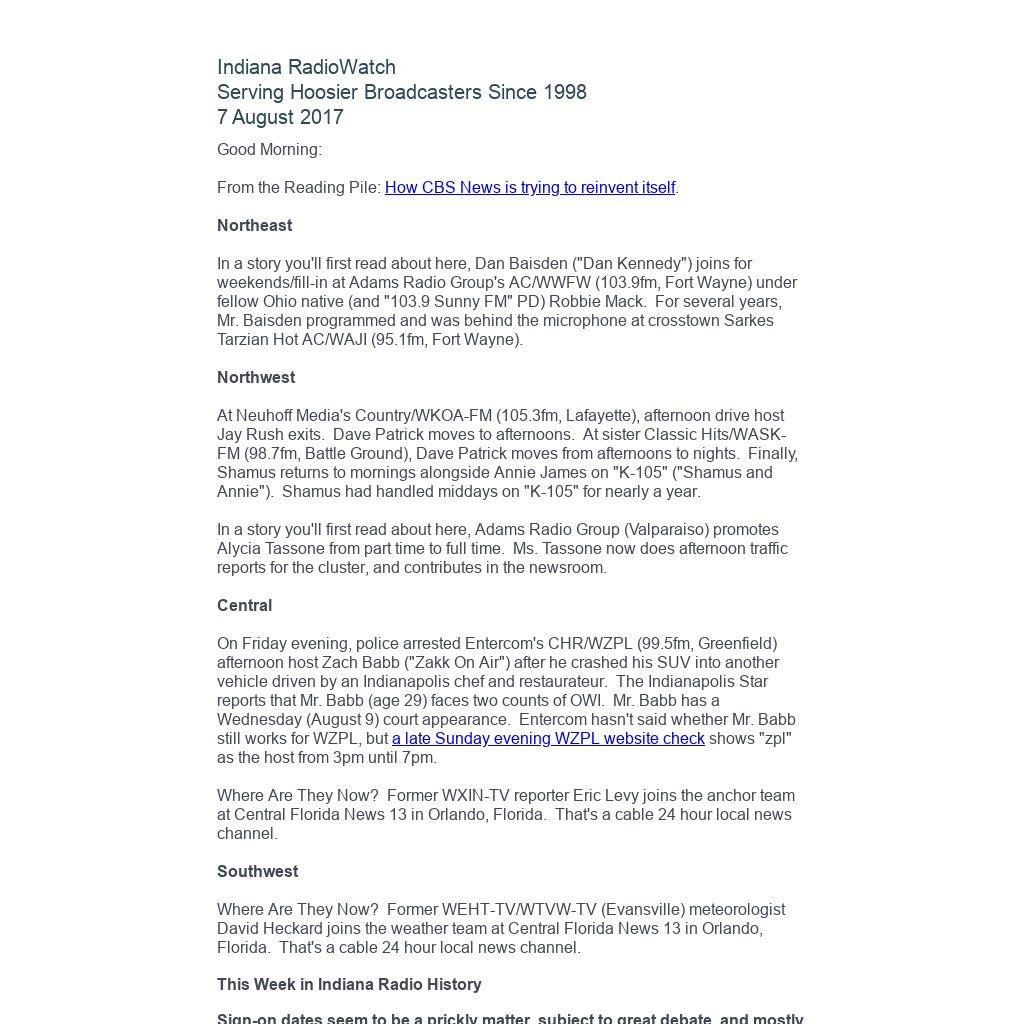 Indiana RadioWatch subscriptions are free. To subscribe, send an e-mail to irw@well.com and we'll add you. After publication, we archive Indiana RadioWatch on the Indiana Radio Archive at http://www.indianaradio.net. Please e-mail us your news stories and employment opportunities.