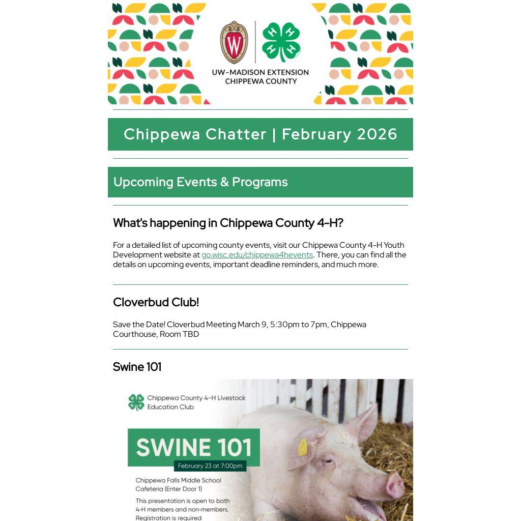 For a detailed list of upcoming county events, visit our Chippewa County 4-H Youth Development website at go.wisc.edu/chippewa4hevents. There, you can find all the details on upcoming events, important deadline reminders, and much more.