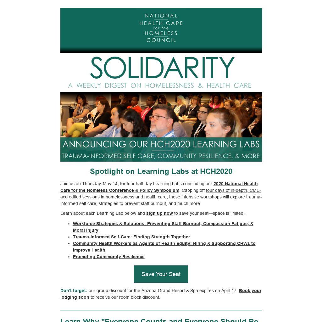 HCH2020 nominations closing soon: HCH2020 awards and steering committee nominations also close on March 1! Nominate yourself or a colleague to help us honor outstanding leadership in health care and homelessness and help guide the strategic direction of our membership groups.