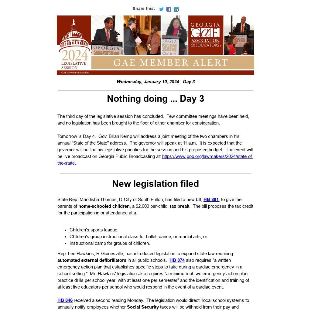 Tomorrow is Day 4. Gov. Brian Kemp will address a joint meeting of the two chambers in his annual "State of the State" address. The governor will speak at 11 a.m. It is expected that the governor will outline his legislative priorities for the session and his proposed budget. The event will be live broadcast on Georgia Public Broadcasting at: https://www.gpb.org/lawmakers/2024/state-of-the-state.