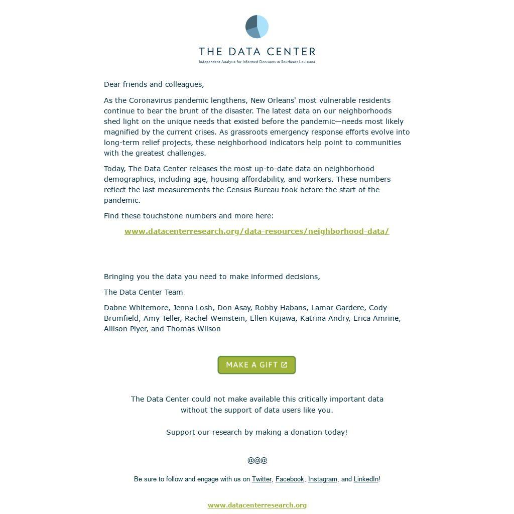 Today, The Data Center releases the most up-to-date data on neighborhood demographics, including age, housing affordability, and workers. These numbers reflect the last measurements the Census Bureau took before the start of the pandemic.