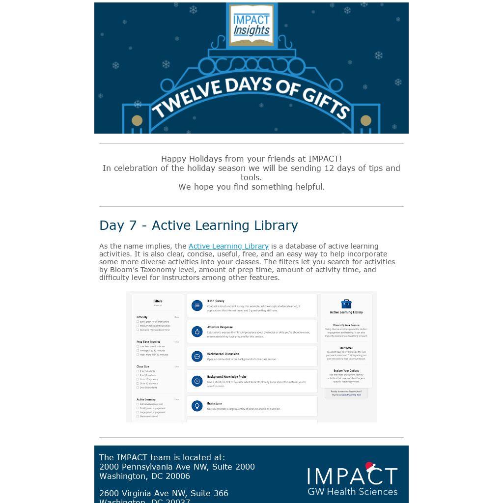 Happy Holidays from your friends at IMPACT! In celebration of the holiday season we will be sending 12 days of tips and tools. We hope you find something helpful.
