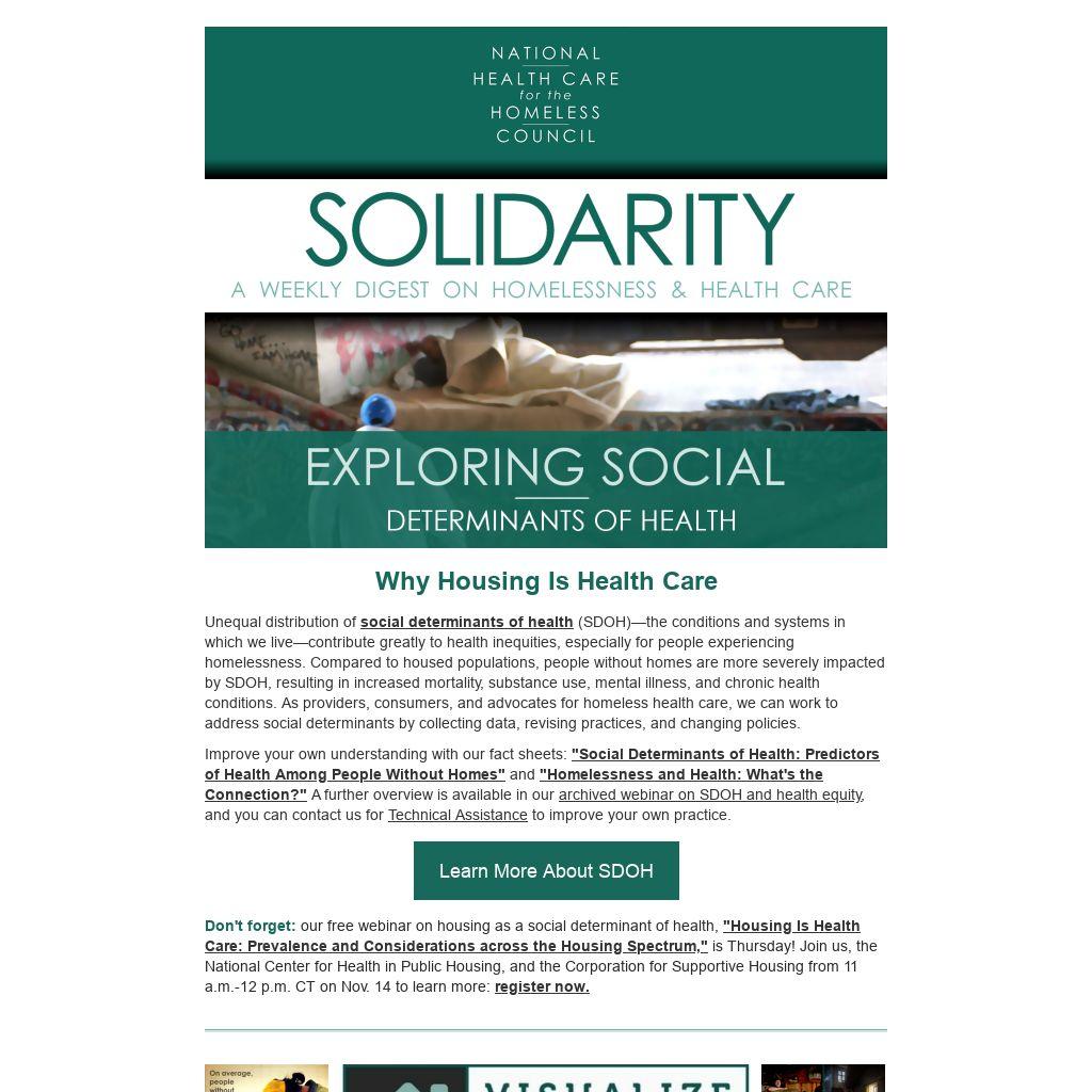 Unequal distribution of social determinants of health (SDOH)—the conditions and systems in which we live—contribute greatly to health inequities, especially for people experiencing homelessness. Compared to housed populations, people without homes are more severely impacted by SDOH, resulting in increased mortality, substance use, mental illness, and chronic health conditions. As providers, consumers, and advocates for homeless health care, we can work to address social determinants by collecting data, revising practices, and changing policies.