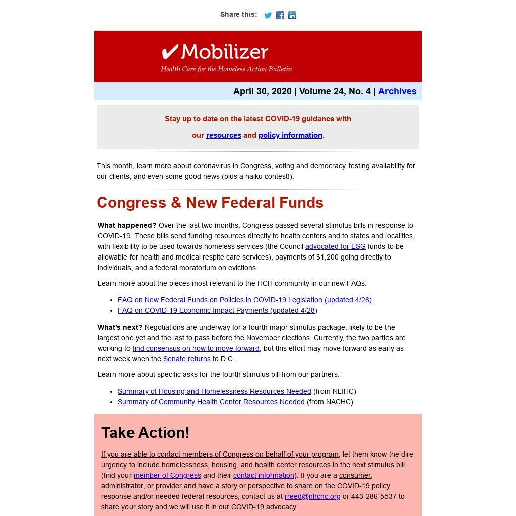 If you are able to contact members of Congress on behalf of your program, let them know the dire urgency to include homelessness, housing, and health center resources in the next stimulus bill (find your member of Congress and their contact information). If you are a consumer, administrator, or provider and have a story or perspective to share on the COVID-19 policy response and/or needed federal resources, contact us at rreed@nhchc.org or 443-286-5537 to share your story and we will use it in our COVID-19 advocacy.