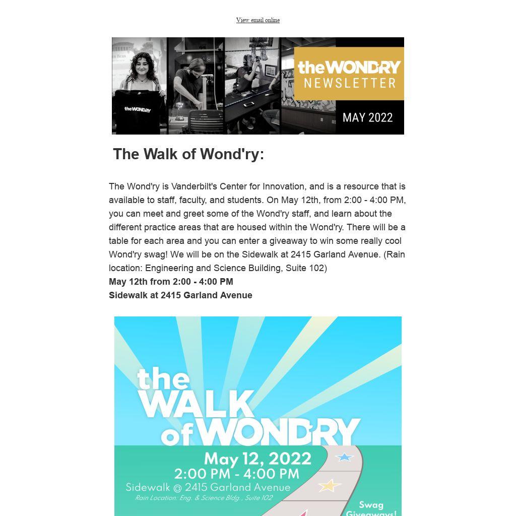 The Wond'ry is Vanderbilt's Center for Innovation, and is a resource that is available to staff, faculty, and students. On May 12th, from 2:00 - 4:00 PM, you can meet and greet some of the Wond'ry staff, and learn about the different practice areas that are housed within the Wond'ry. There will be a table for each area and you can enter a giveaway to win some really cool Wond'ry swag! We will be on the Sidewalk at 2415 Garland Avenue. (Rain location: Engineering and Science Building, Suite 102)