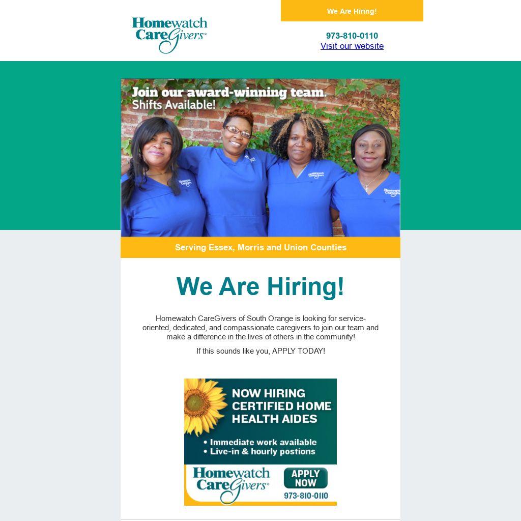 Homewatch CareGivers of South Orange is looking for service-oriented, dedicated, and compassionate caregivers to join our team and make a difference in the lives of others in the community!