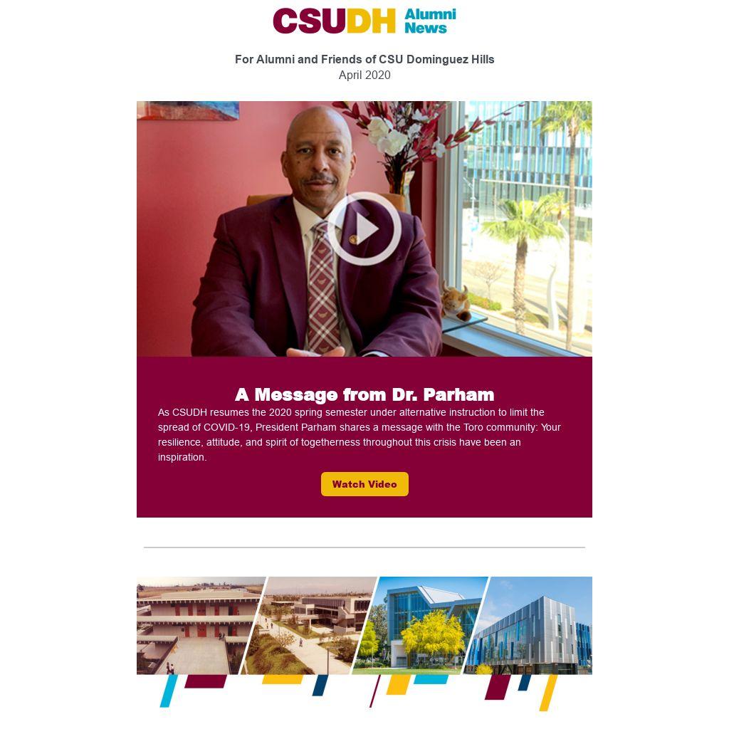 A Message from Dr. Parham As CSUDH resumes the 2020 spring semester under alternative instruction to limit the spread of COVID-19, President Parham shares a message with the Toro community: Your resilience, attitude, and spirit of togetherness throughout this crisis have been an inspiration.