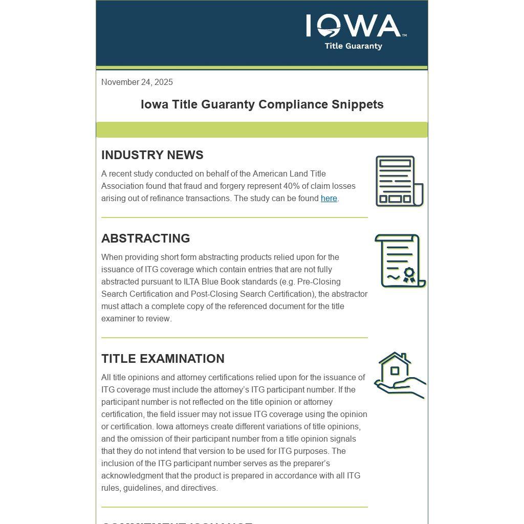 All title opinions and attorney certifications relied upon for the issuance of ITG coverage must include the attorney’s ITG participant number. If the participant number is not reflected on the title opinion or attorney certification, the field issuer may not issue ITG coverage using the opinion or certification. Iowa attorneys create different variations of title opinions, and the omission of their participant number from a title opinion signals that they do not intend that version to be used for ITG purposes. The inclusion of the ITG participant number serves as the preparer’s acknowledgment that the product is prepared in accordance with all ITG rules, guidelines, and directives.