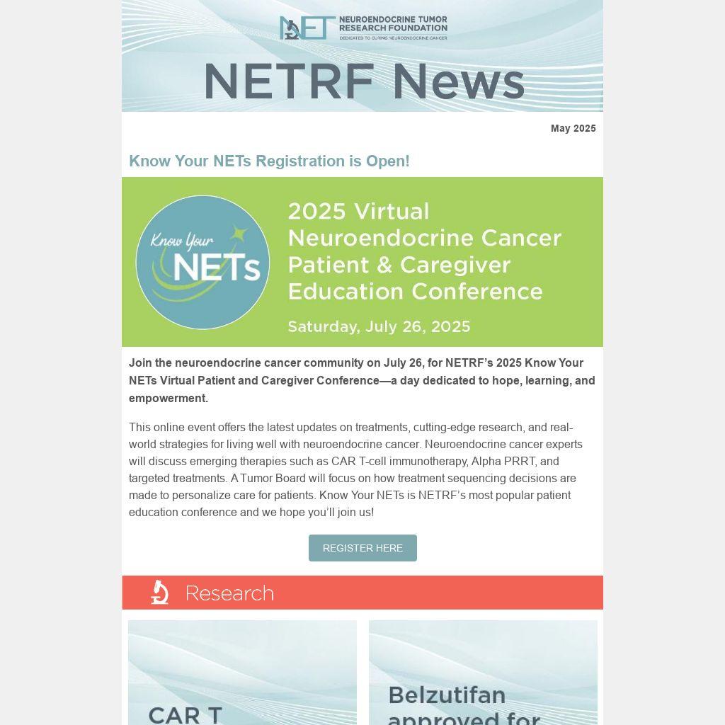 Join the neuroendocrine cancer community on July 26, for NETRF’s 2025 Know Your NETs Virtual Patient and Caregiver Conference—a day dedicated to hope, learning, and empowerment.